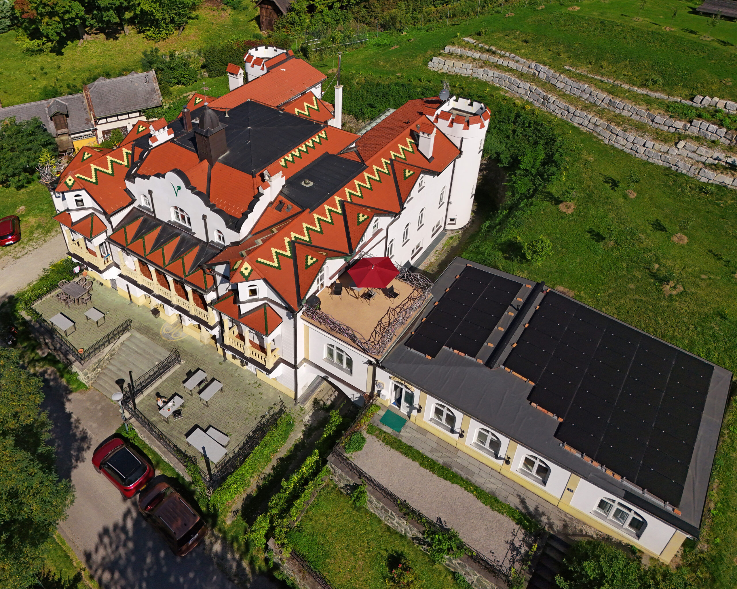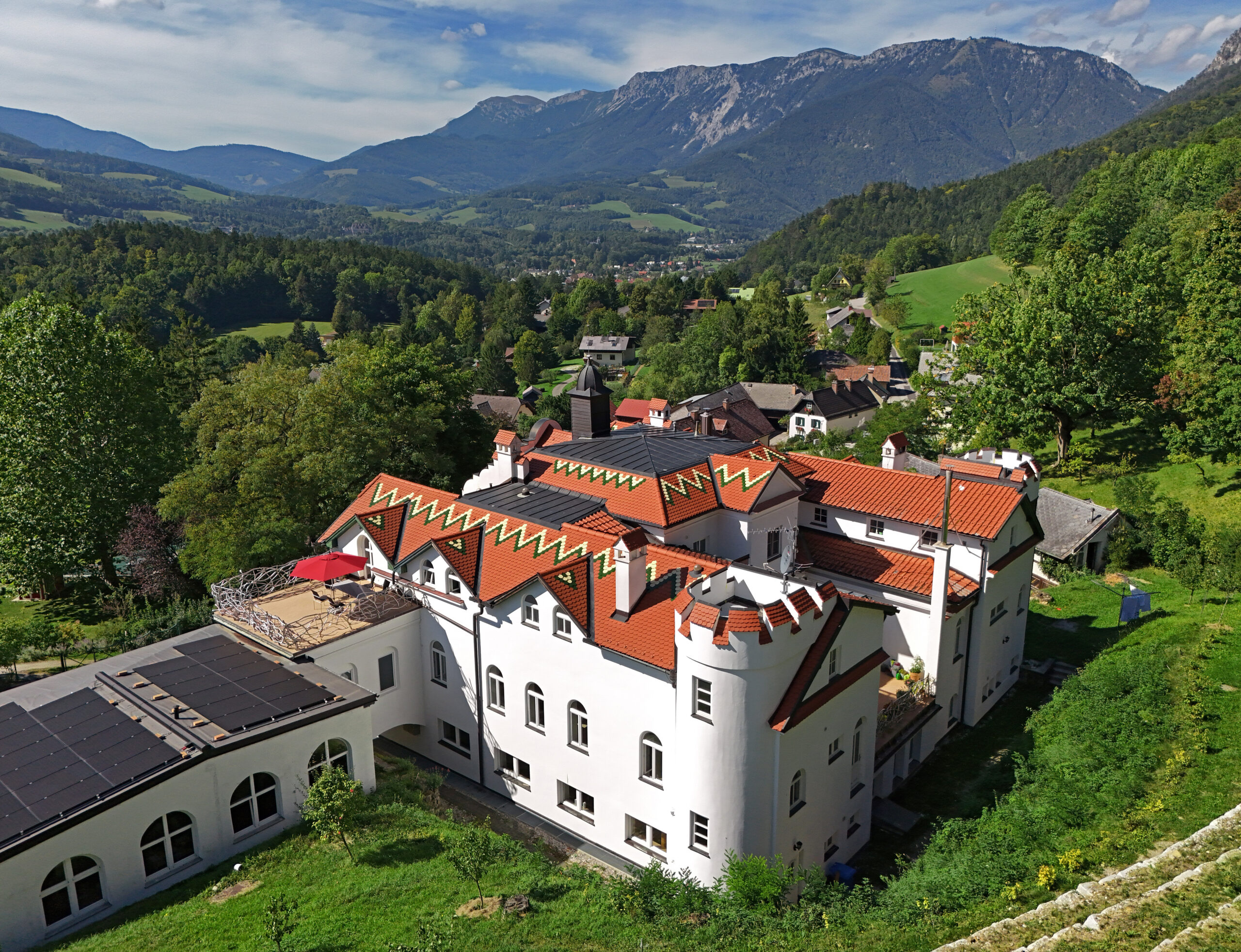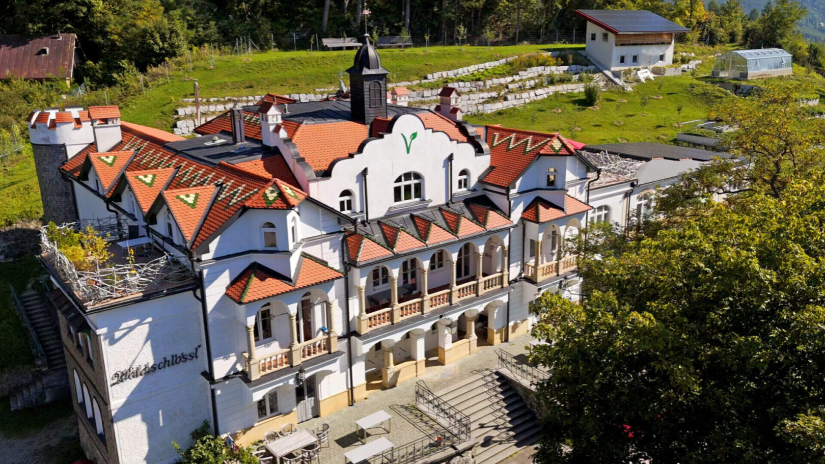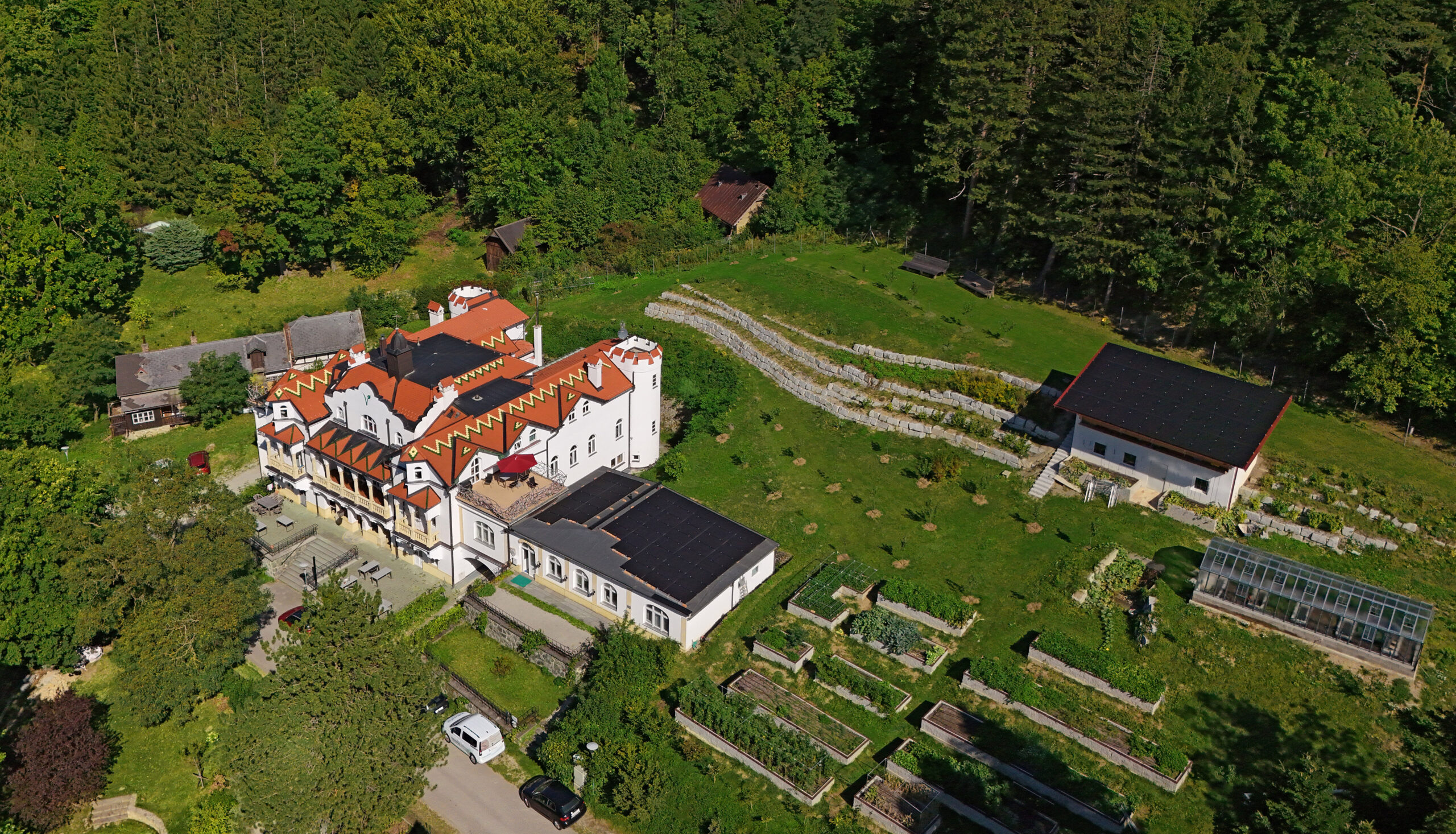 Bisher lag das Hauptaugenmerk auf der Sanierung des Waldschlössls. Außerdem haben wir bereits das Dach des Bürogebäudes neu gedeckt und die Photovoltaik-Anlage installiert. Unser Garten ist bepflanzt und gedeiht.
